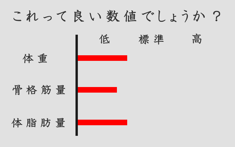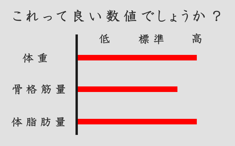 一応もう一度、一般的な理想の数値についても言っておきますが、体重・体脂肪量を骨格筋量が上回っている < ではなく > の形になっていれば問題ありません。