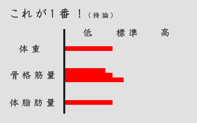 総合すると体重と体脂肪が低めで筋量は好みに合わせるのが1番!